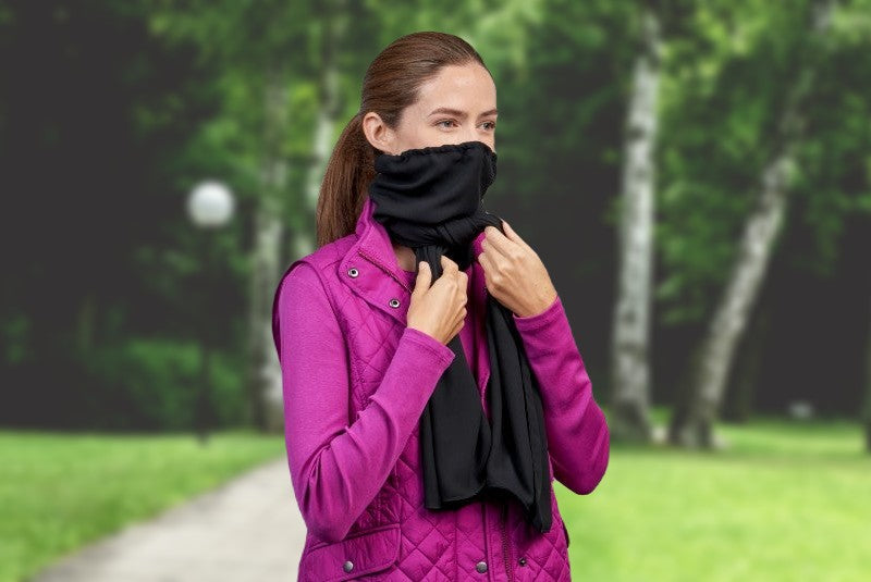 In congested public areas, simply pull the scarf up over the nose for filtration efficiency superior to a surgical mask.